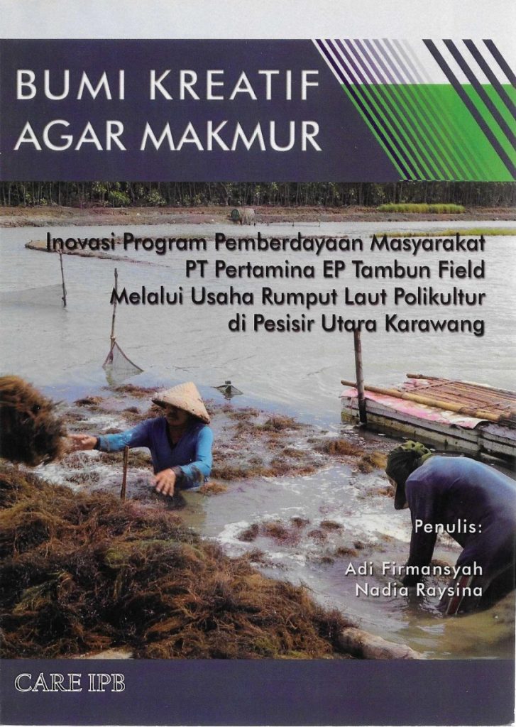 Bumi Kreatif Agar Makmur merupakan inovasi program pemberdayaan masyarakat yang digagas oleh PT. Pertamina EP Asset 3 Tambun Field dan mitra binaan koperasi rumput laut di Karawang. Program ini bertujuan untuk meningkatkan nilai tambah limbah rumput laut yang pada akhirnya dimaksudkan untuk meningkatkan pendapatan masyarakat pesisir utara Kabupaten Karawang. Buku ini menyajikan inovasi pemberdayaan masyarakat yang dikembangkan oleh PT. Pertamina EP Asset 3 Tambun Field dalam mengimplementasikan program pengembangan masyarakat. Di bagian akhir buku ini membahas tentang pelajaran-pelajaran penting pembedayaan masyarakat dalam rangka CSR.