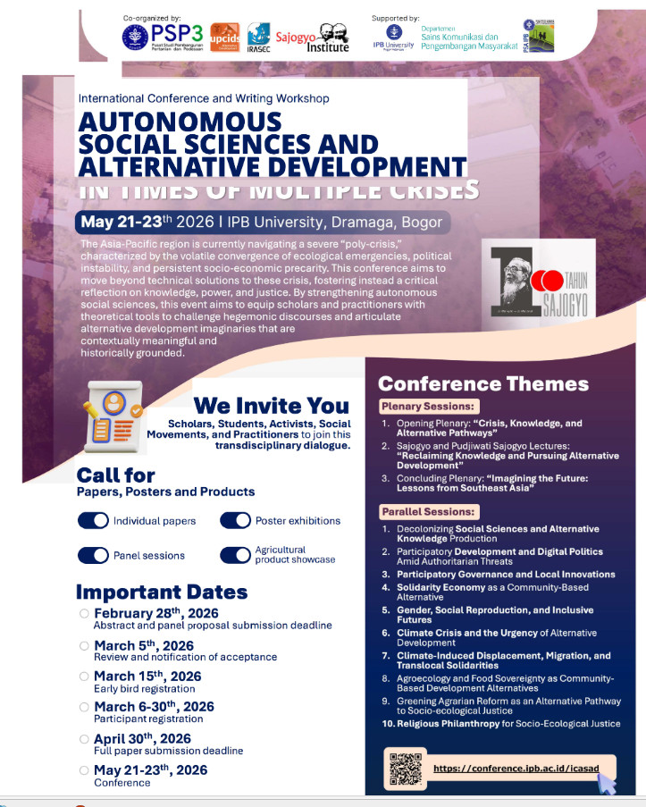 Konferensi internasional ini akan dilaksanakan secara hybrid pada 21–23 Mei 2026 di Kampus IPB Dramaga, Bogor, dengan menghadirkan para akademisi, peneliti, dan praktisi dari berbagai negara. Diskusi akan berfokus pada tiga tema utama, yaitu (1) Krisis, Pengetahuan, dan Jalur Alternatif; (2) Merebut Kembali Pengetahuan dan Mengejar Pembangunan Alternatif: Pelajaran dari Indonesia; serta (3) Membayangkan Masa Depan: Pelajaran dari Asia Tenggara. Selain sesi pleno dan paralel, kegiatan ini juga dilengkapi dengan workshop penulisan akademik untuk mendukung publikasi ilmiah para peneliti muda.