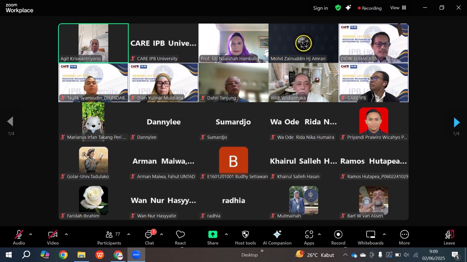 Senin, 2 Juni 2025, Center for Alternative Dispute Resolution and Empowerment (CARE) Lembaga Riset Internasional bekerja sama dengan Doctoral Program of Natural Resources and Environmental Management Sciences (NREMS) Sekolah Pascasarjana IPB University, telah sukses menyelenggarakan Kuliah Umum bertema “Mediation Mechanism in Resolving Environmental Conflict” secara daring. Kuliah umum ini dipandu oleh Dr. Agit Kriswantriyono, SP, MSi, Sekretaris CARE LRI IPB University serta dihadiri oleh 77 peserta, mulai dari mahasiswa, dosen, peneliti, penyuluh, hingga mediator. Peserta berasal dari berbagai institusi, termasuk IPB University, Universitas Tadulako, Universitas Lampung, Universitas Lambung Mangkurat, Universitas Riau, Universitas Mataram, Universitas Pattimura, Institut Syariah Negeri Junjungan Bengkalis, dan Universiti Islam Malaysia, serta Dewan Bandaraya Kuala Lumpur. Antusiasme peserta menunjukkan tingginya minat dan kebutuhan terhadap pendekatan damai dan inklusif dalam penyelesaian konflik lingkungan di Indonesia.